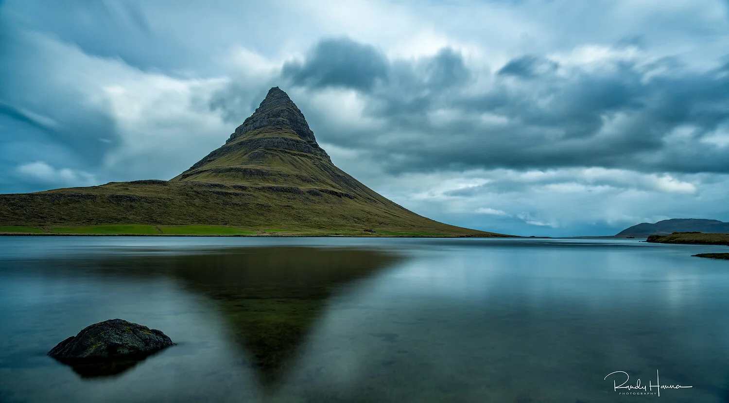 After staying in for an hour or two at breakfast, we decided to venture out into the rain in hopes of some clearing. Luck was again on our side and we had only a very slight drizzle once we arrived at our location. With everyone prepared for the weather and high tide on our side, we hit the bay next to Kirkjufell for some reflection work. This area has been very productive for me in the past and the clouds really added to the morning shoot affording me a different look than my previous images. I love going where other people seldom go (everyone and their brother was across the street trying to shoot the waterfalls at high tide.....how funny).