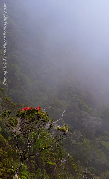 Our attempt to visit the Kalalau Lookout at Kokee to get a clear view of the Na Pali’s Kalalau Valley was unsuccessful due to land fog. This fog is formed not long after sunrise when the sun starts heating up the ground surface near the ocean. The warming along with the cool moist conditions at altitude, generates a moving bank of fog that gently rises and falls up and down the valley. Best times for clear viewing are first thing in the morning, and late afternoon. In our case, all I photographed was fog. Next year…..